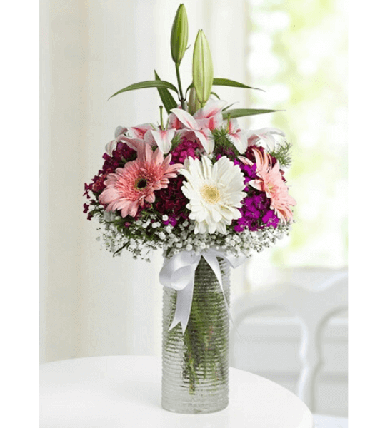 Vazoda Beyaz Gül ve Mevsim Çiçekli Aranjmanı