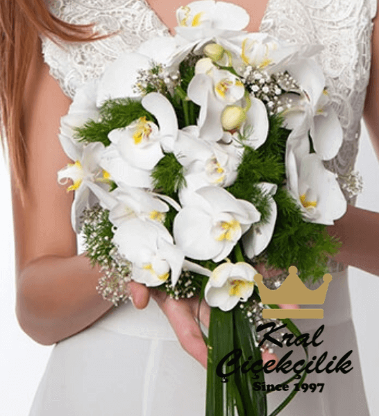 Orkide taneleri beyaz gül goncaları ve kurdele tasarımı ile dikkatinizi çekebilir